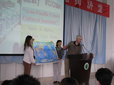 为加强对外文化交流,2009年5月18日上午,美国“亚太跨文化协会”三位专家梅尔文•巴伯、南希•巴伯、瑞贝卡•伯克在我院龙子湖校区A区学术报告厅为外语系师生带来一场主题为“亚太文化差异”的精彩报告。报告会由学院外籍教师麦丽乔亚•奥帕拉主持。来自田纳西州孟菲斯大学的梅尔文•巴伯博士就美国田纳西州的地理、文化等方面进行详细的讲解。南希•巴伯和瑞贝卡•伯克就有关美国的商业、饮食文化、大学的校园生活、年轻人独立性等进行风趣、幽默的介绍,并与在座的师生进行了互动。这次报告会的内容引起与会师生的强烈兴趣,梅尔文•巴伯、南希•巴伯、瑞贝卡•伯克他们别具风趣的演讲报告会上不时传来热烈的掌声。