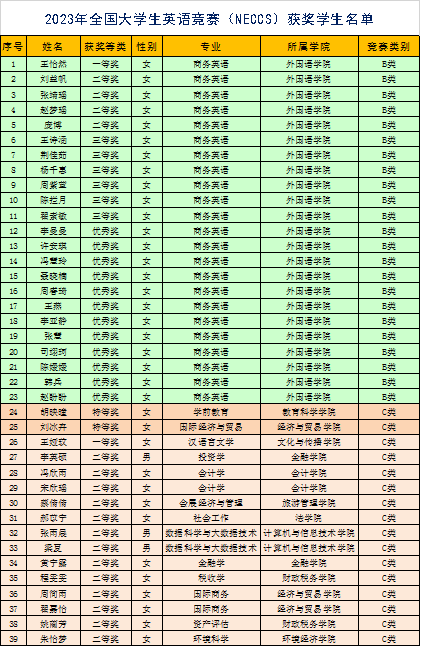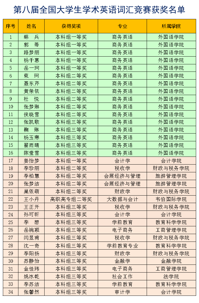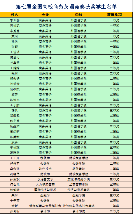 在第七届全国高校商务英语竞赛中,该校学子共有37名同学获奖,其中李亚静等7人获一等奖,王佳瑞等9人获二等奖,孙梦云等21人获三等奖。