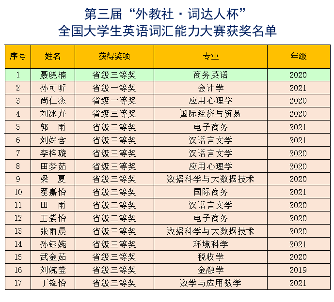 在第三届“外教社·词达人杯”全国大学生英语词汇能力大赛省级复赛中,该校91名参赛选手中共有17名同学获奖,其中会计学院2021级会计学专业学生孙可昕同学、教育科学学院2020级应用心理学专业学生尚仁杰同学获得省级一等奖,威廉williamhill体育2020级商务英语本科一班学生聂晓楠等15名同学获得省级三等奖。