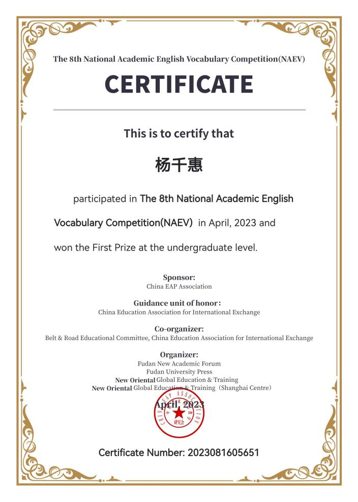 第八届全国大学生学术英语词汇竞赛获奖证书