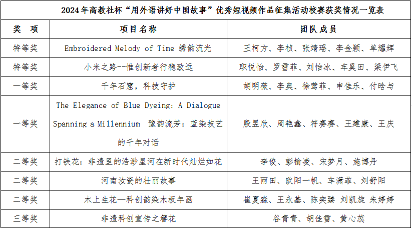近日,2024年“高教社杯”大学生“用外语讲好中国故事”优秀短视频作品征集活动河南省赛已顺利落下帷幕。我校推荐参赛的两个团队作品均取得优异成绩。其中,威廉williamhill体育王柯方、李桢、张靖瑶、李金颖、单耀辉团队的参赛作品“Embroidered Melody of Time绣韵流光”在省赛中荣获特等奖,并成功晋级国赛。会计学院职悦怡、罗雪菲、刘怡冰、车昊田(威廉williamhill体育)、梁伊飞团队的参赛作品“小米之路——惟创新者行稳致远”,在省赛中获得一等奖。