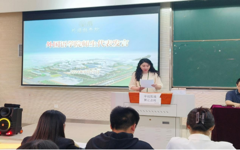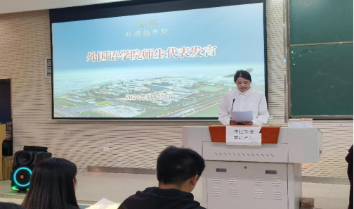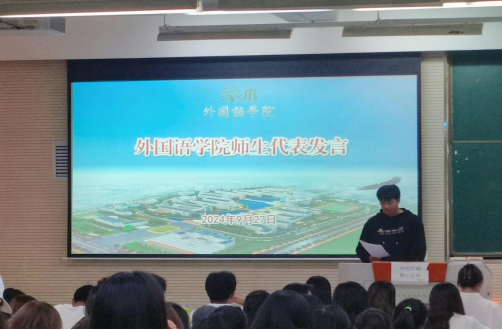 商务英语教研室汪凡凡教授作为教师代表发言。她以自己的教学经历为例,阐述了教师对于学生成长的重要性,并表达了对新同学们的美好祝愿。2022级商务英语1班刘梦振同学作为老生代表,分享了她在校期间的学习经验与心得,激励新生们珍惜时光,勤奋学习。2024级赵俊杰与孙可莹同学分别作为新生代表相继发言,他们表达了对大学生活的憧憬与期待,并承诺将不负韶华,努力成为具有国际视野的优秀人才。