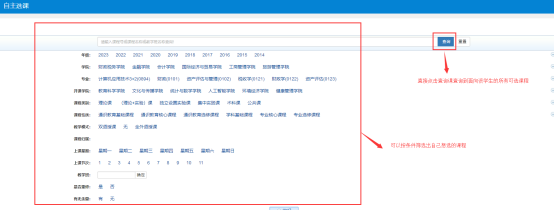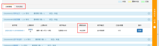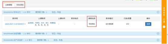 需要注意的是,若某门课程为“专业选修课”则该门课程选课信息中的课程性质为“专业选修”,若某门课程为“学校特色课”则该门课程选课信息中的课程性质为“学校特色”,如上图所示。