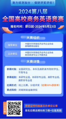 为激发我校学生学习英语的兴趣,促进其英语能力发展,通过以赛促教、以赛促学的途径与方法,促进英语教、学、测协调发展,为我校学生搭建学生风采展示平台,我校决定组织参加由中国对外贸易经济合作企业协会商务英语专业工作委员会主办的“第八届全国高校商务英语竞赛”。现将有关工作通知如下: