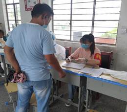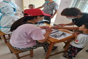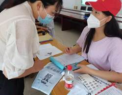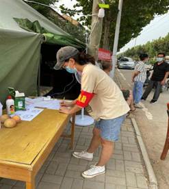 2019级英语教育一班刁淑颖同学在此次疫情防控期间,2021年8月5日和6日期间在河南省商丘市夏邑县济阳镇进行集中核酸检测时,帮助医护人员做好相关登记工作。
