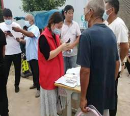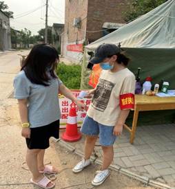 2019级英语教育一班李晓静同学在此次疫情防控期间,2021年8月5日至8月9日在河南省兰考县考城镇魏花园村志愿在村口防疫卡点值班车辆登记工作、帮助村民做核酸检测扫码信息登记工作。