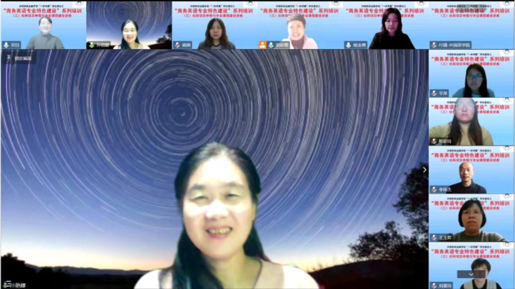 为了进一步凝练专业特色,提升威廉williamhill体育教师的科研意识和水平,11月23日晚,郑州轻工业大学威廉williamhill体育孙艳娜教授应邀在线为我院进行了“社科项目申报与专业课程建设”的专题培训。培训会历时两个小时,由商务英语专业带头人刘彩霞教授主持,我院35位教师参加此次培训。